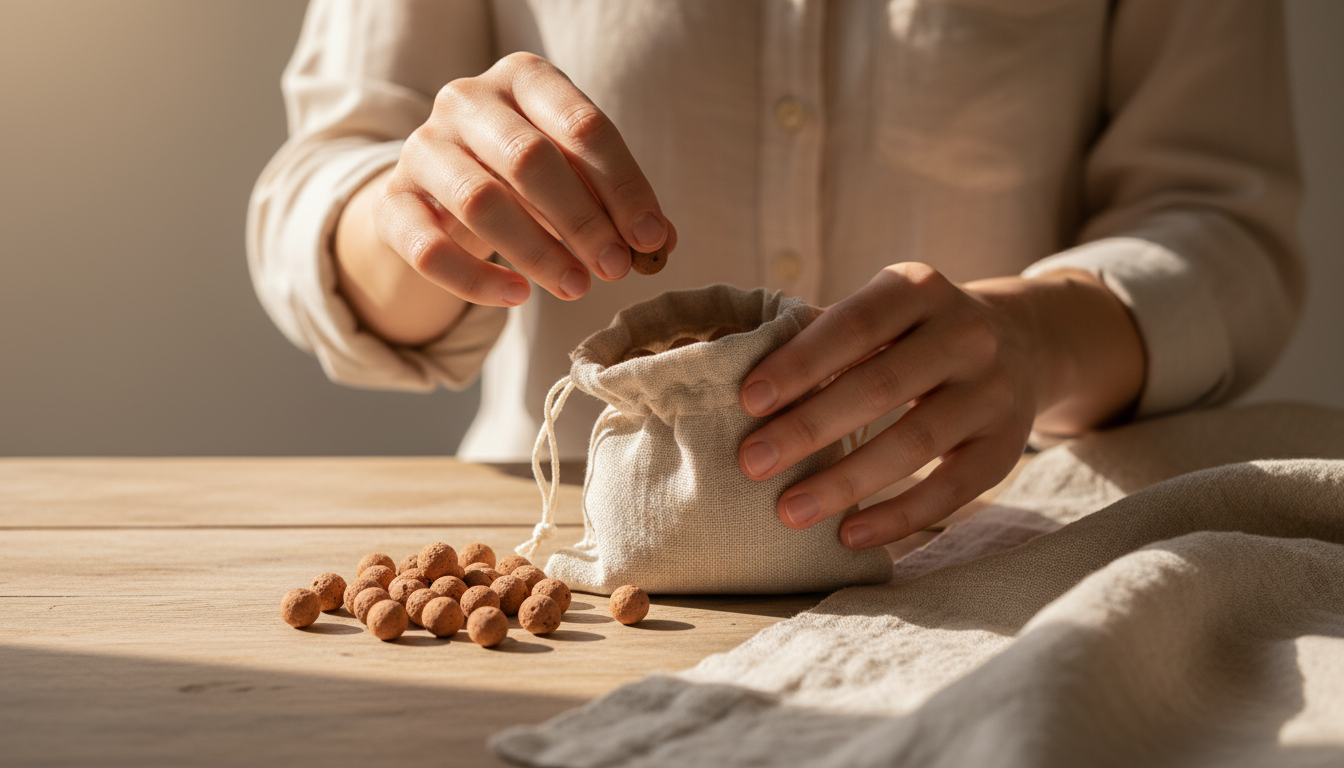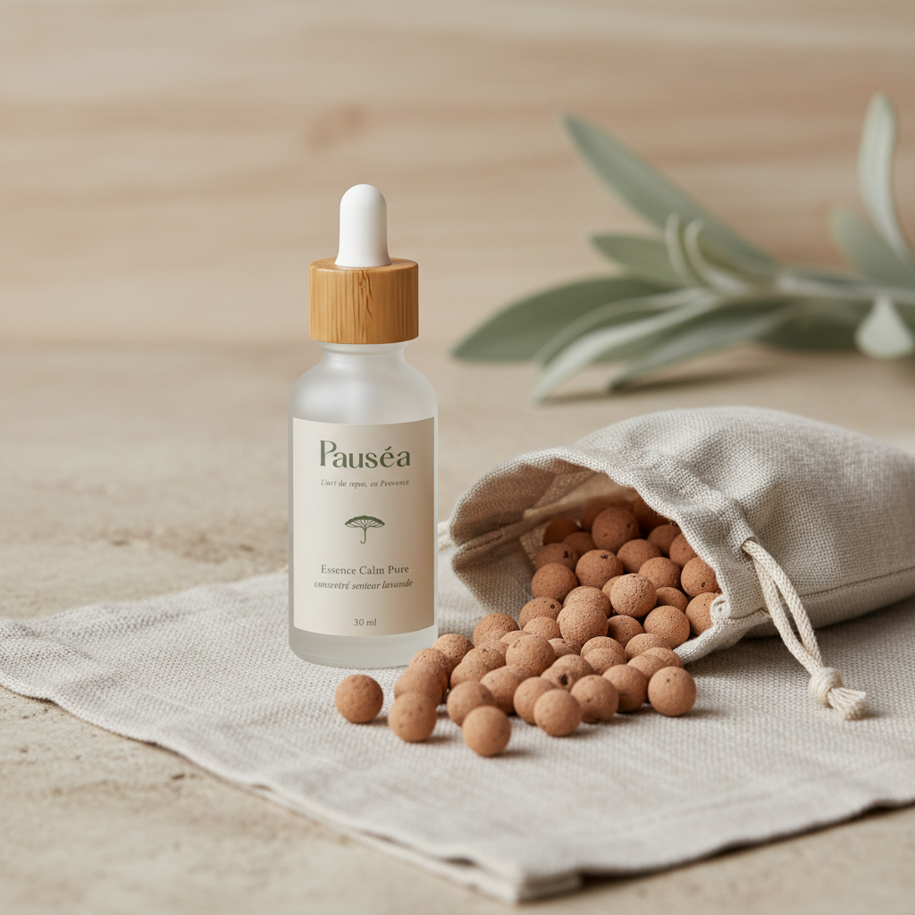 Tu déposes simplement quelques gouttes sur les billes d’argile ou sur un support poreux. Ça diffuse doucement sans parfum chimique.